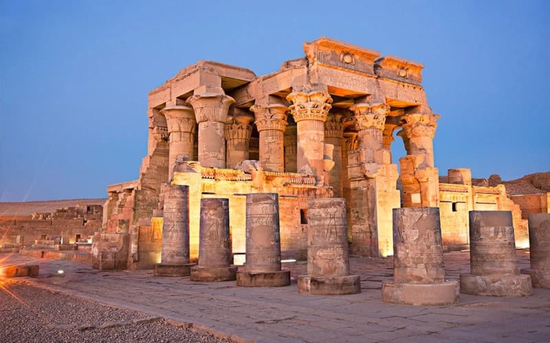 Explore o fascinante Templo de Kom Ombo. Maravilhe-se com sua arquitetura, dedicada a dois deuses. Viaje no tempo e descubra a história do Antigo Egito